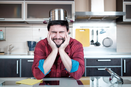 面白い料理 彼の頭に鍋を台所で魅力的な白人男性 の写真素材 画像素材 Image